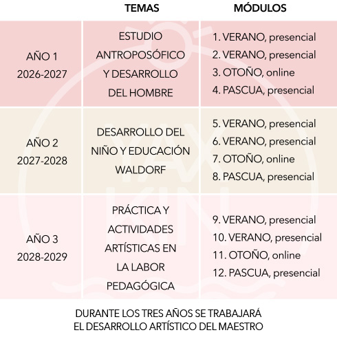La formación -que inicia en Verano, 2026- consta de 12 módulos, cursando al año 3 módulos presenciales y uno Online.